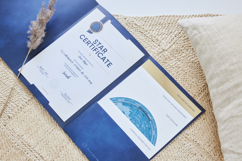 Dopo aver nominato una stella tramite l’apposito link e aver inserito tutte le informazioni necessarie riceverai la bella Confezione regalo OSR. Arriverà a casa tua un bellissimo cofanetto con tutte le informazioni necessarie e un certificato che puoi anche appendere o tenere in bella vista come oggetto di arredamento.